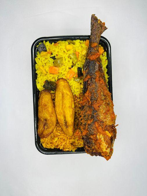 & Free Shipping1 plate of jollof rice, fried rice, plantain, and croaker fish