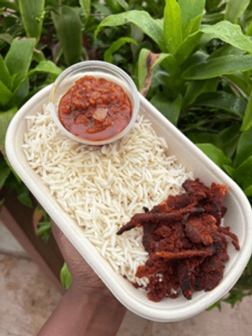 basmati white rice, (2)suya sticks and sauce